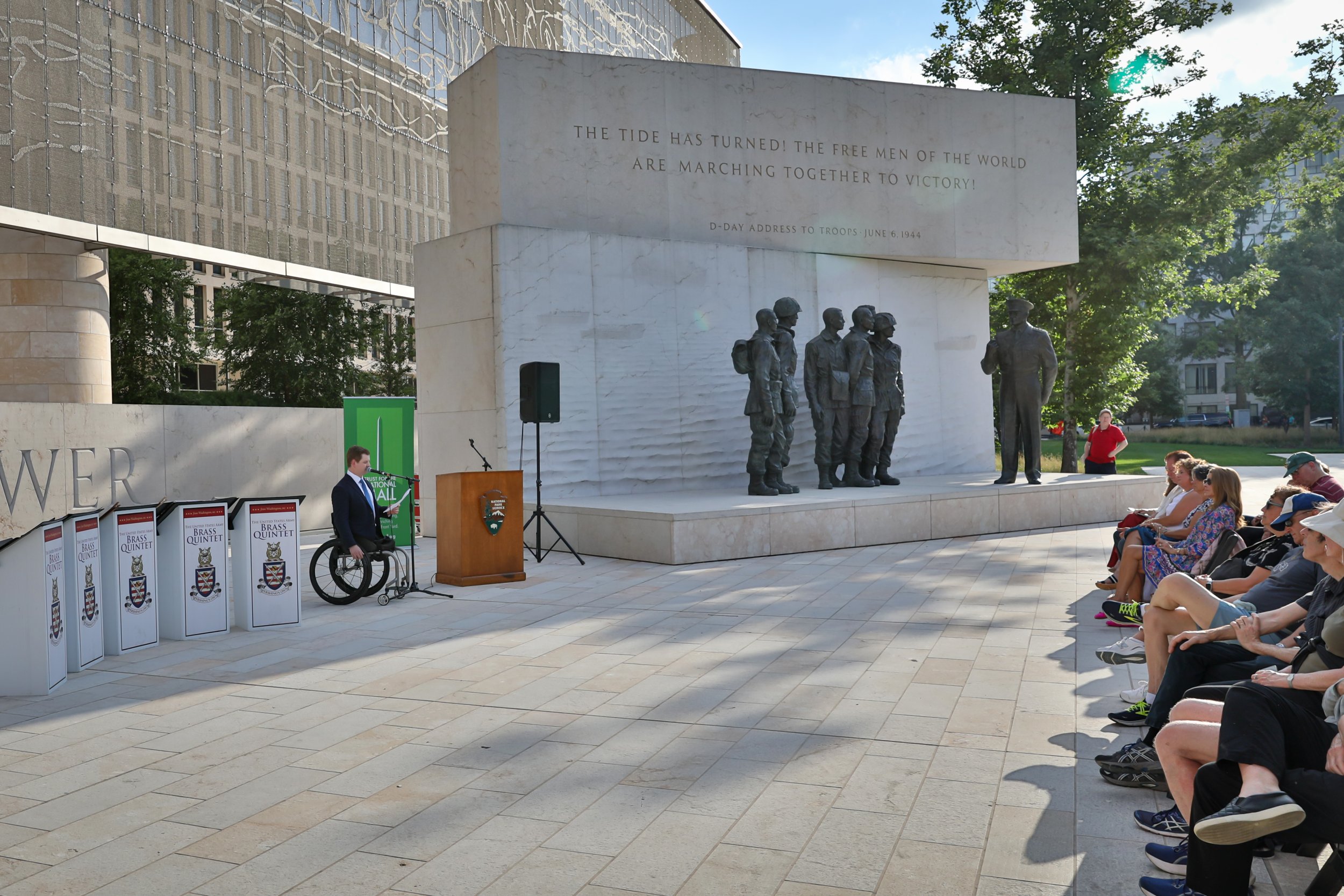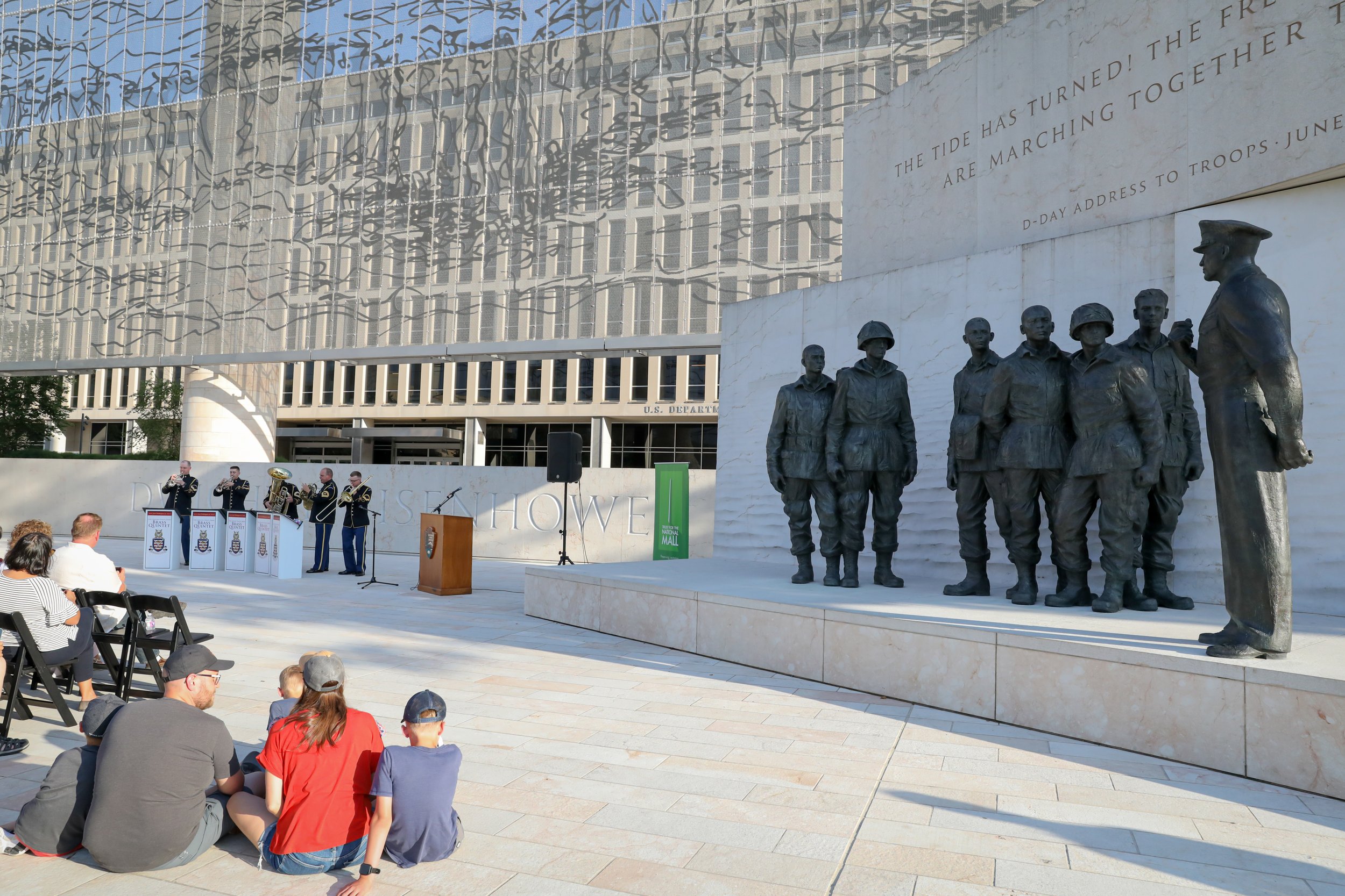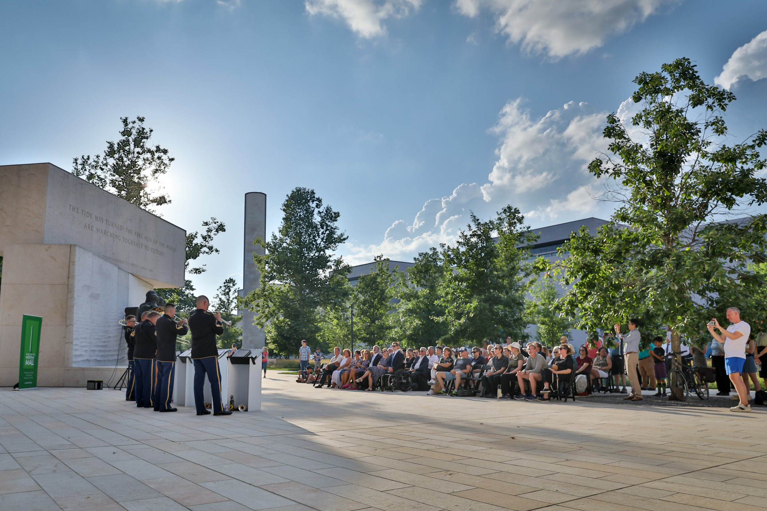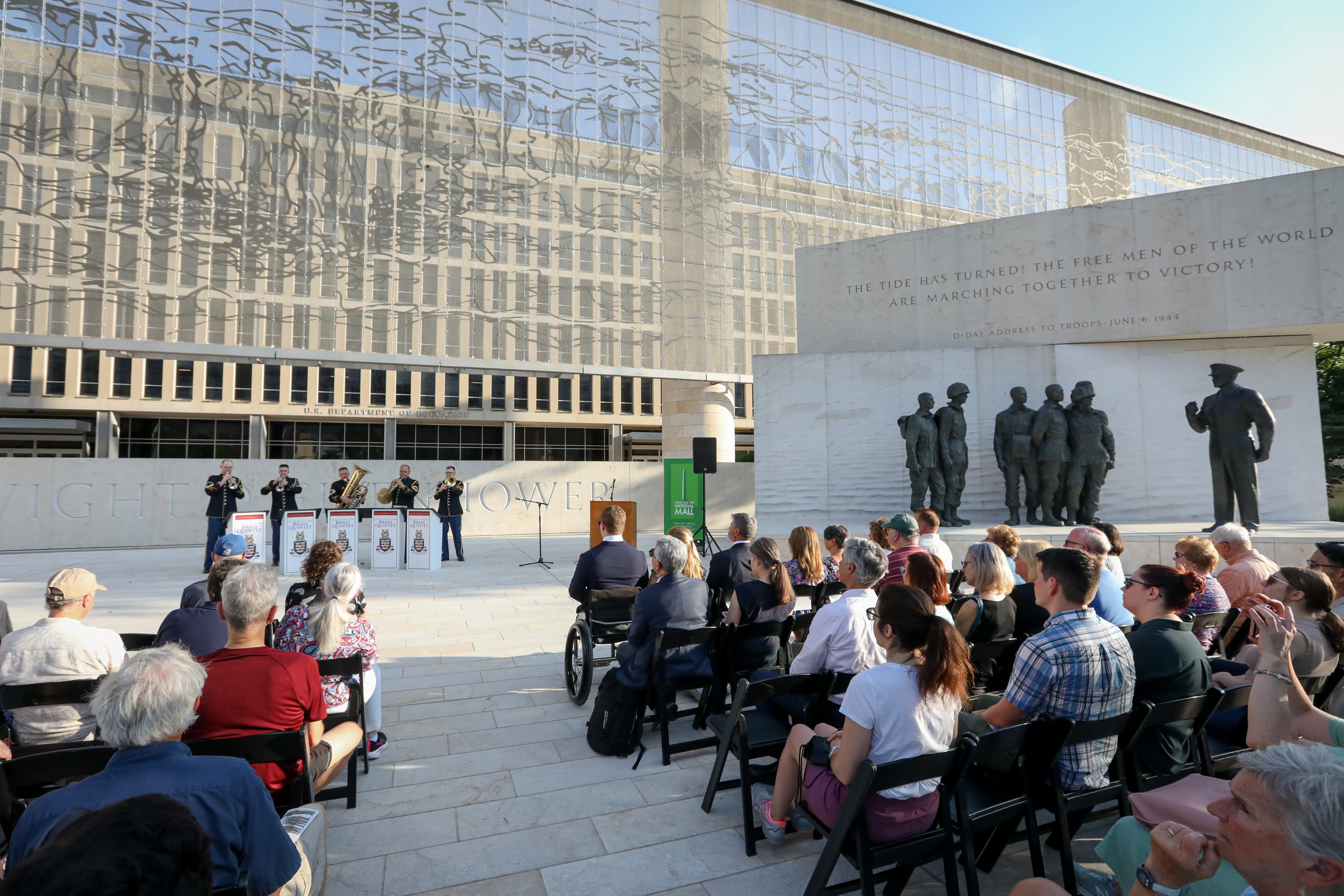 On June 6, 2024, the Trust for the National Mall hosted a commemorative concert at the Dwight D. Eisenhower Memorial marking the 80th anniversary of the World War II D-Day operation. Audience members, families and groups picnicking on the lawn joined us for remarks from a Purple Heart veteran and a performance by a quintet from the U.S. Army Band “Pershing’s Own” during the golden hours of sunset.