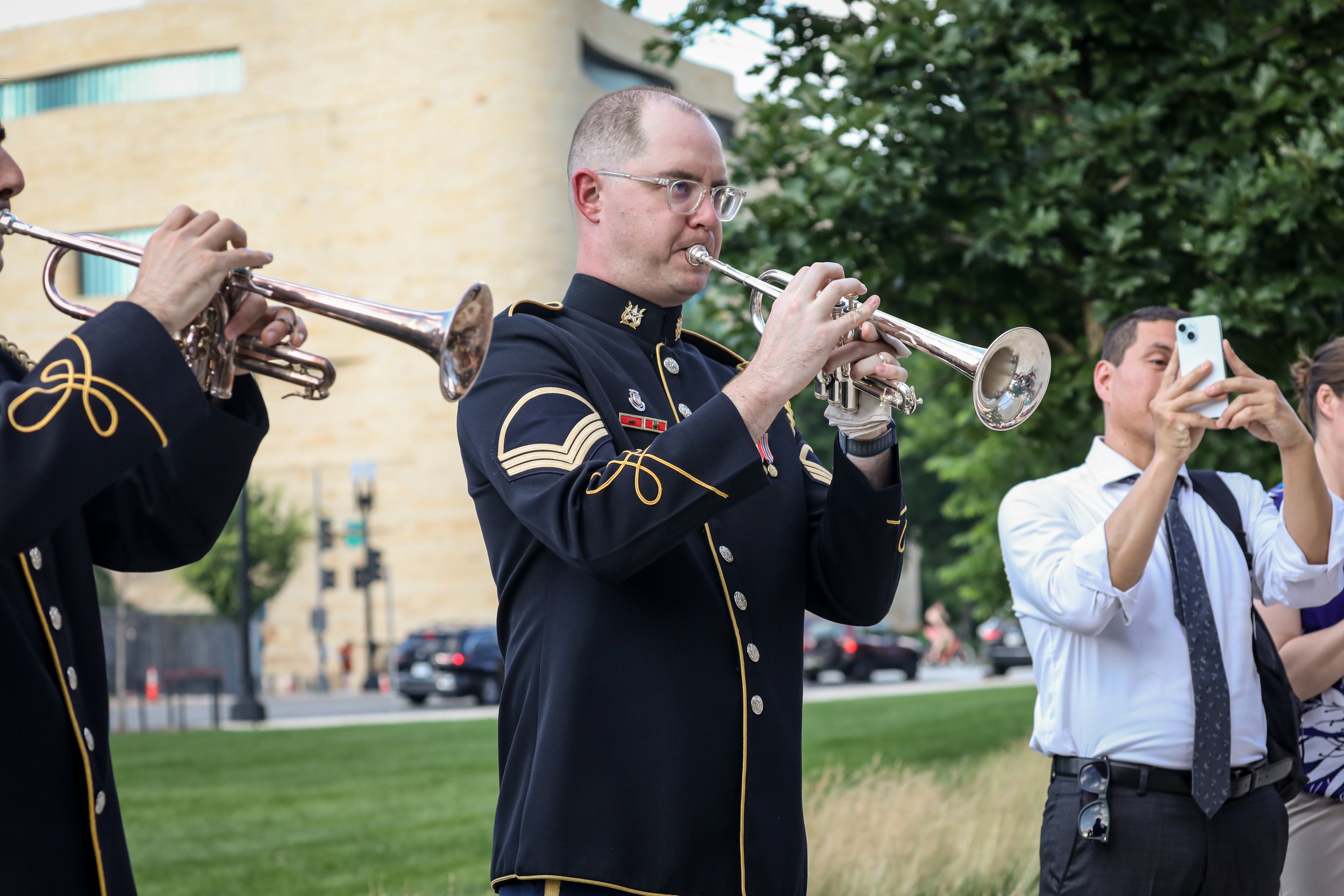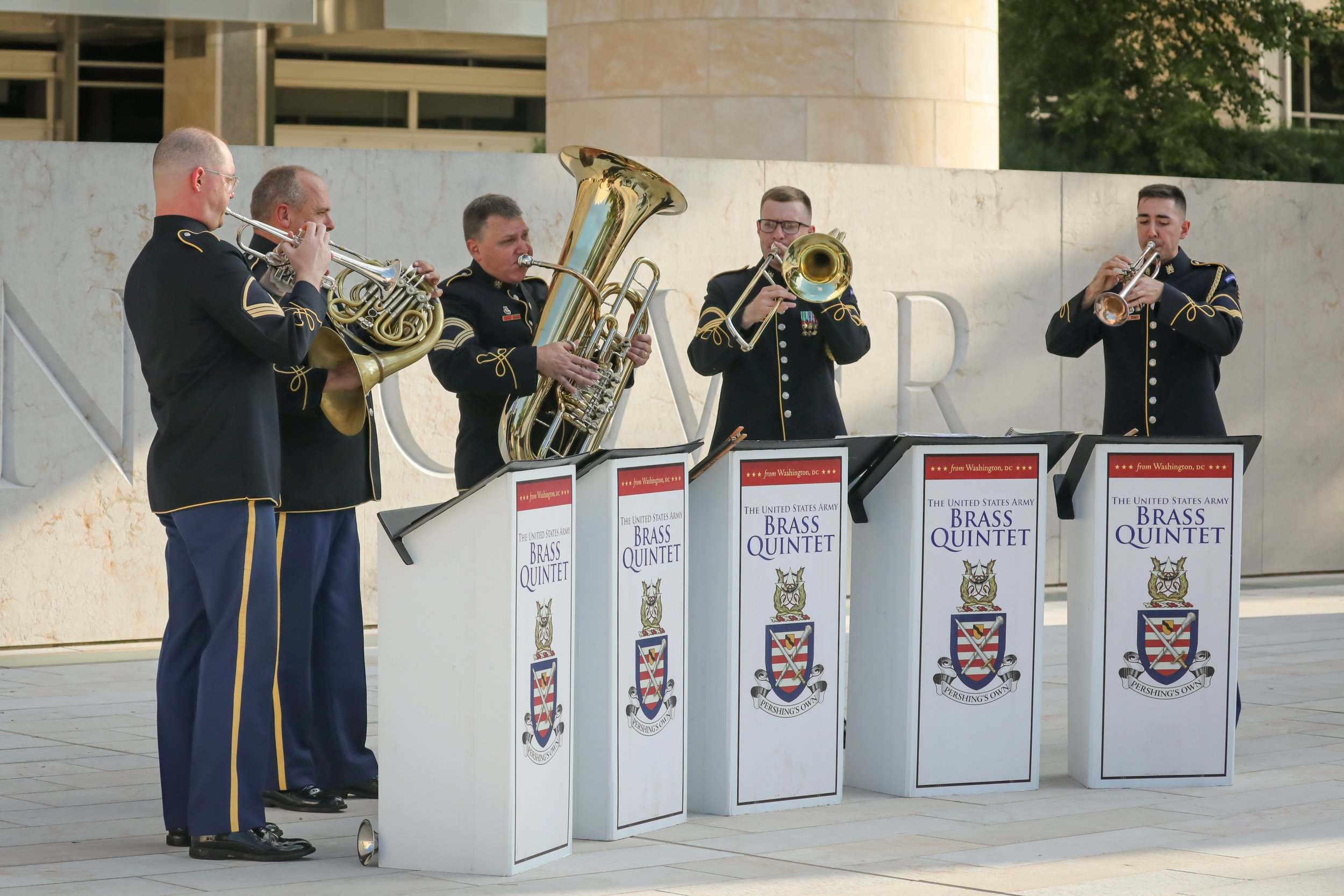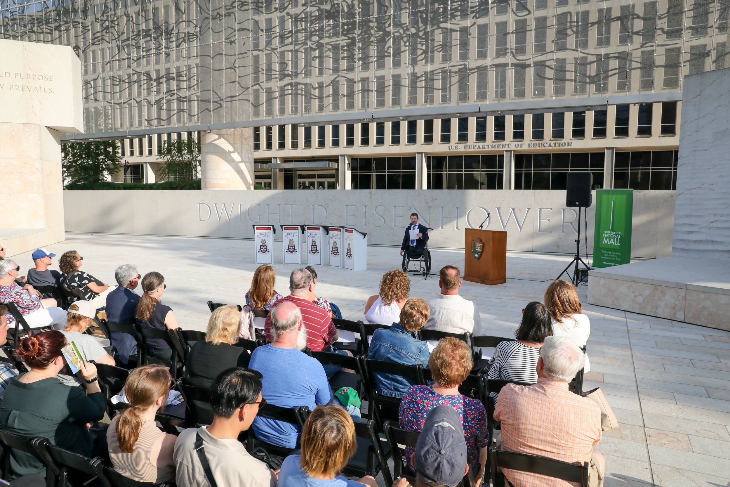 On June 6, 2024, the Trust for the National Mall hosted a commemorative concert at the Dwight D. Eisenhower Memorial marking the 80th anniversary of the World War II D-Day operation. Audience members, families and groups picnicking on the lawn joined us for remarks from a Purple Heart veteran and a performance by a quintet from the U.S. Army Band “Pershing’s Own” during the golden hours of sunset.
