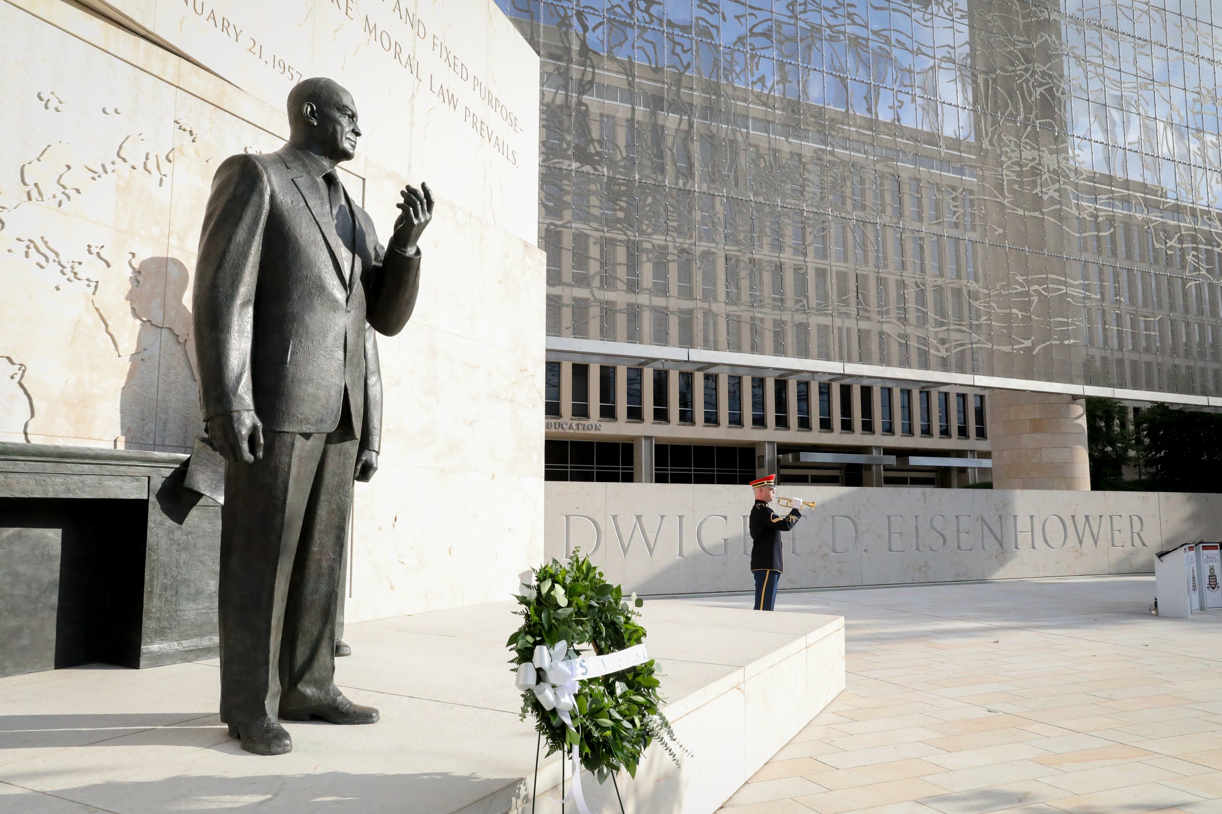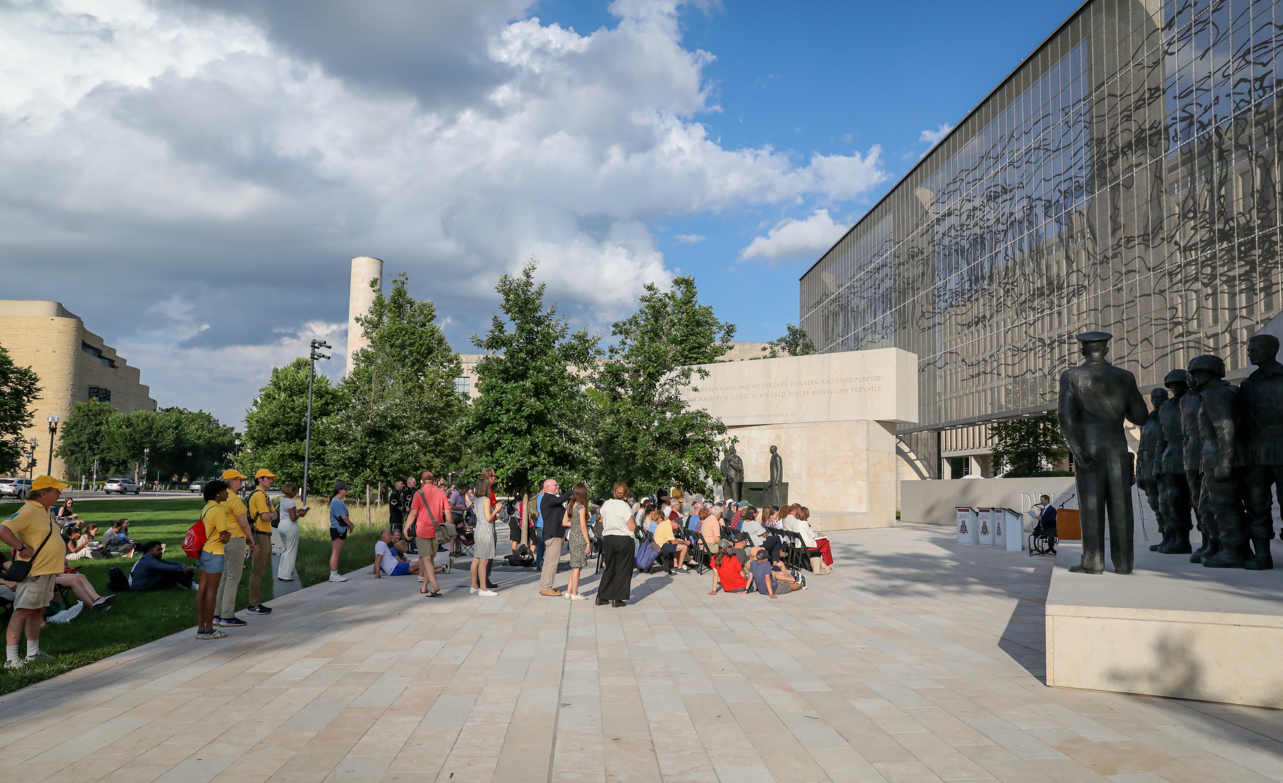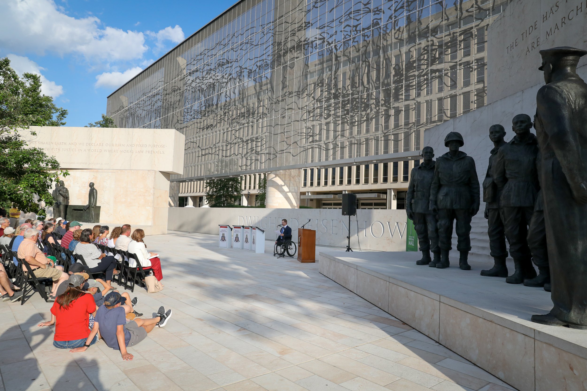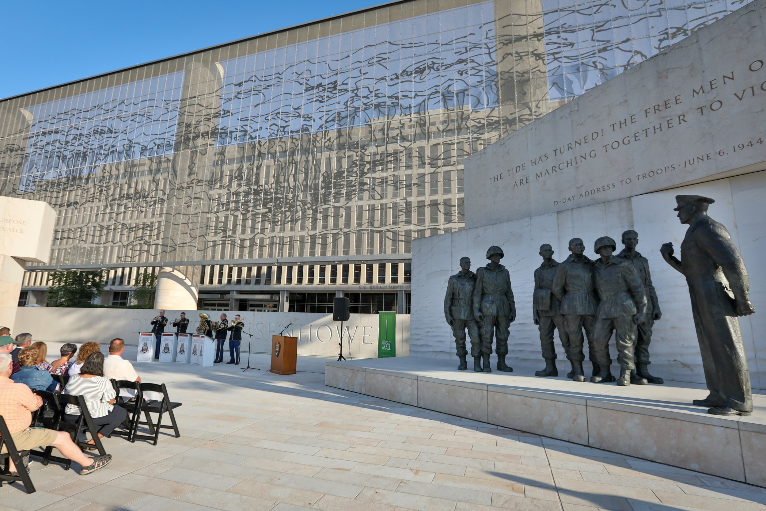 Guests were welcomed to the Dwight D. Eisenhower Memorial by Volunteers-in-Parks, who guided visitors through tours of the memorial, sharing more about the symbolism behind various design elements. In one section of the memorial, General Eisenhower can be seen addressing the paratroopers of the 101st Airborne Division – the first men to land on the Normandy Coast on D-Day.