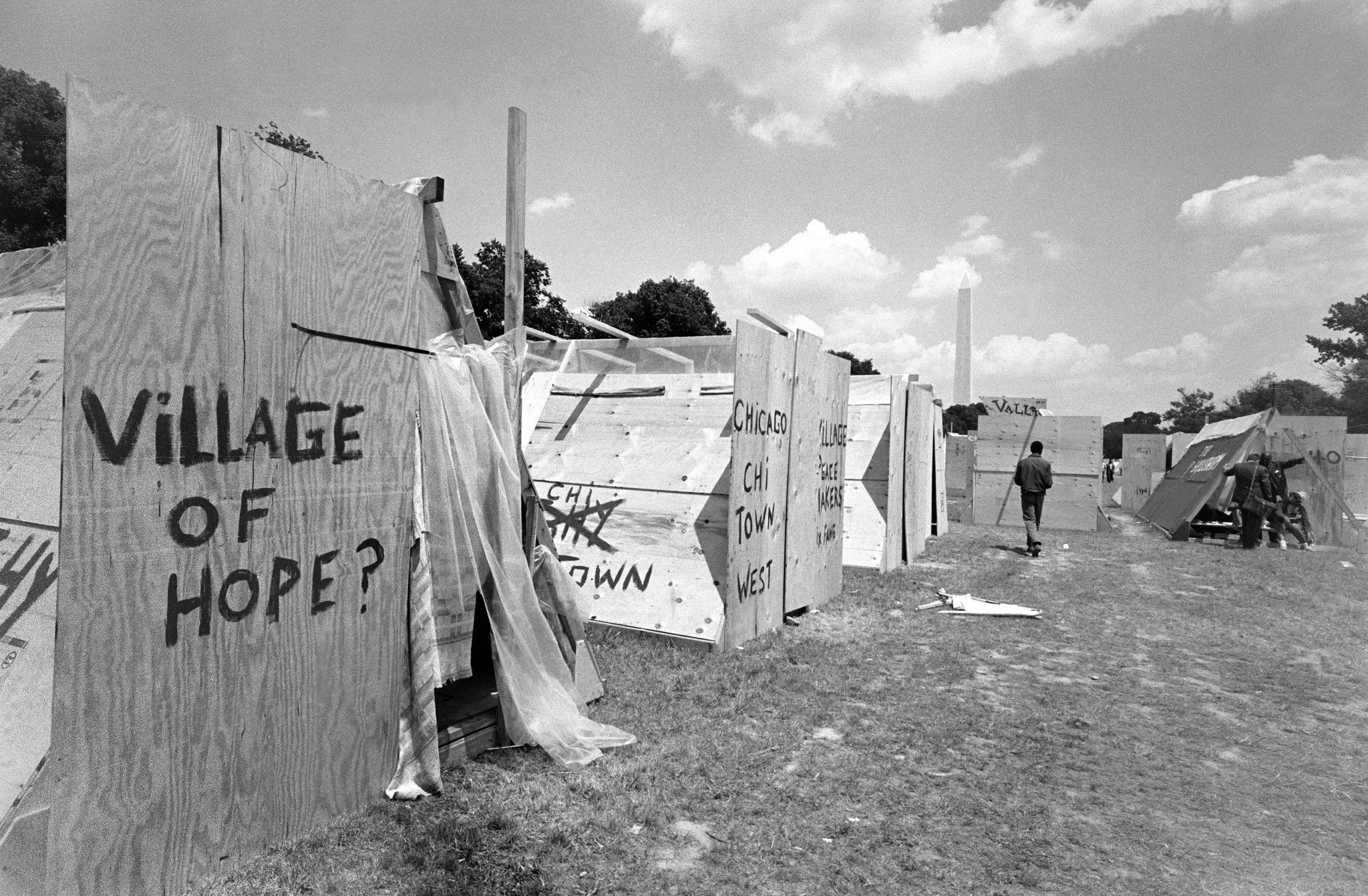 Resurrection City, organized by Ralph Abernathy, was part of the 1968 Poor People’s Campaign, a demonstration for full employment and living wages. During May 1968 thousands of demonstrators representing communities across the country lived in a shantytown of plywood and canvas homes south of the Reflecting Pool. Intense rainfall flooded the encampment and internal dissension plagued the city. Resurrection City’s Park Permit expired on June 23. The next day, police moved through the area, tearing down the buildings and arresting nearly 300 people. Sometimes remembered as a failure, Resurrection City nonetheless brought together many disparate groups to work toward common goals.