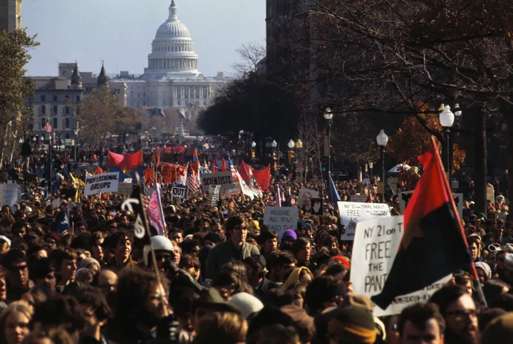The U.S. Capitol looms in the background as thousands of people march along Pennsylvania Avenue during anti-Vietnam Moratorium on November 15, 1969. Bettmann/Getty Images