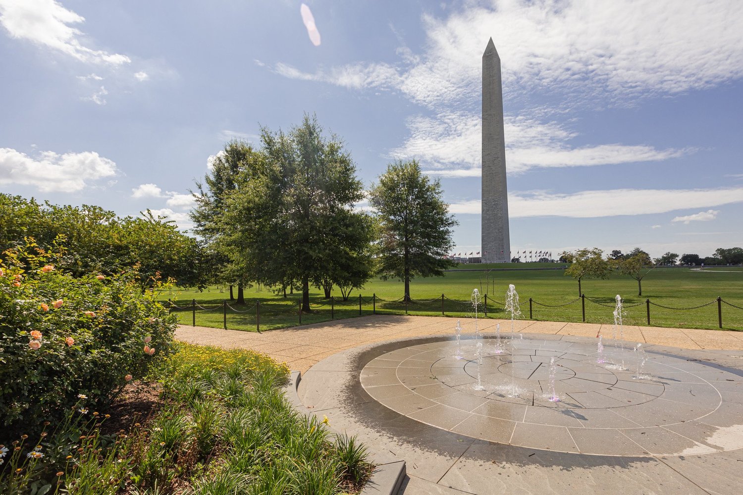 Strategically sited benches provide views of the Washington Monument to the south and the White House to the north. Fountains embedded within granite cobblestone-paved circles lie in counterpoint to the rectilinear form of the overall garden. The circles of the hardscape intersect with axial paths, reminiscent of the larger-scale patterns characteristic of the National Mall.
