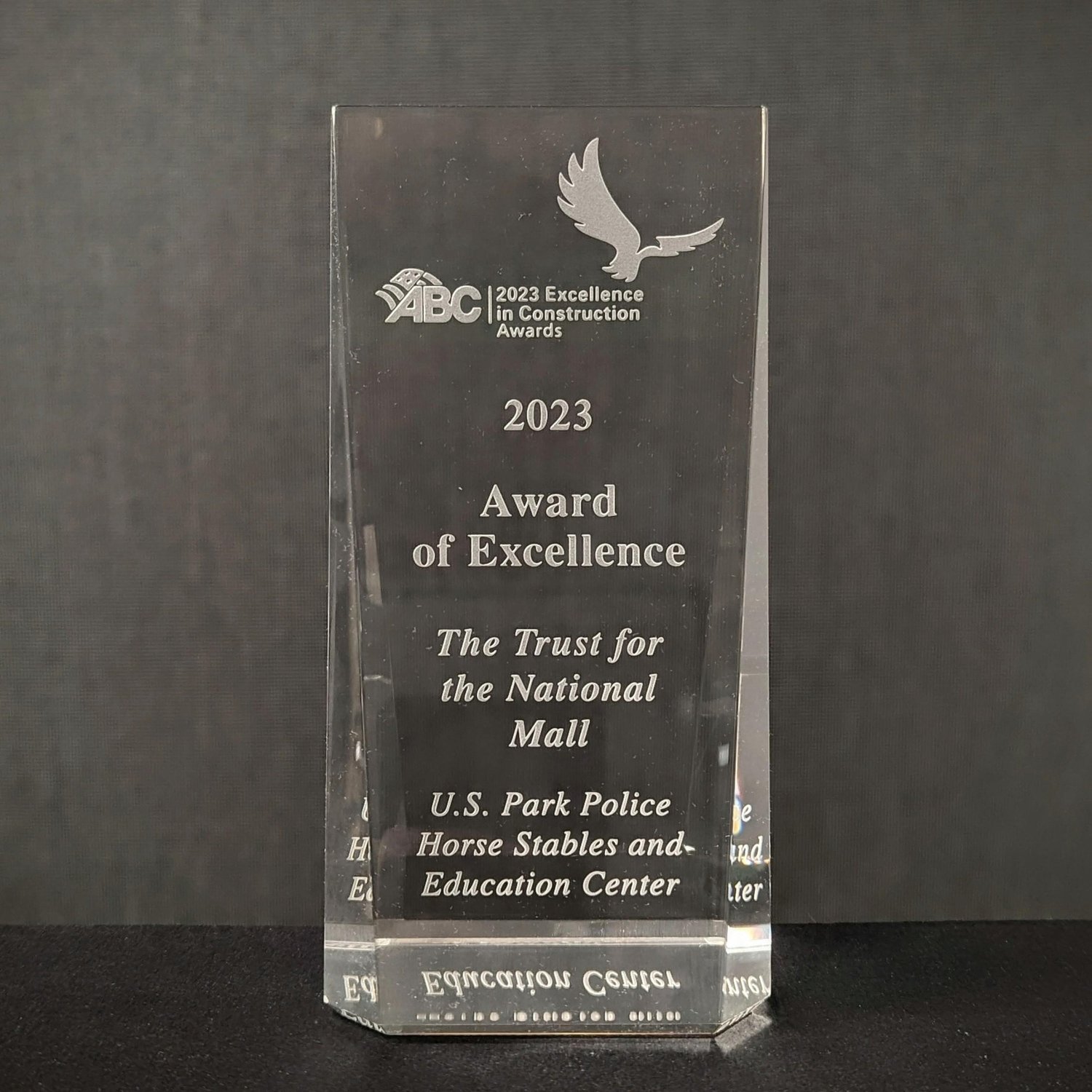 The Trust for the National Mall was honored with the “Award of Excellence” for our work on the U.S. Park Police Horse Stables and Education Center. The Trust was recognized in the 2023 Excellence in Construction Awards hosted by Associated Builders and Contractors.