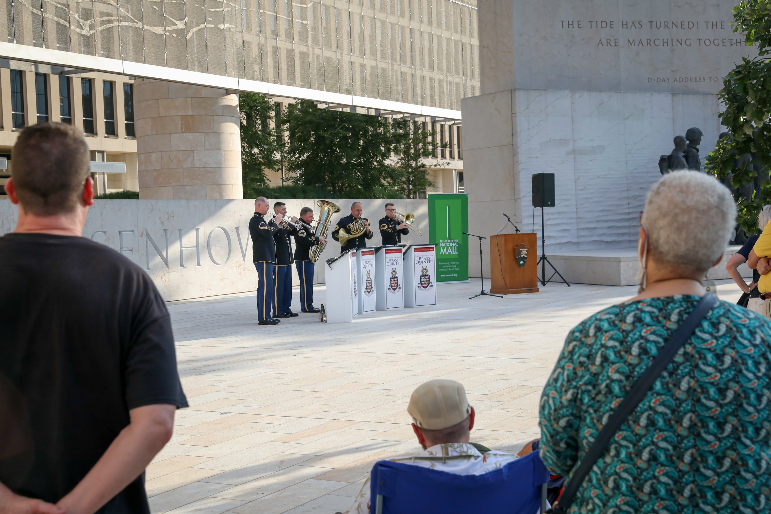 On June 6, 2024, the Trust for the National Mall hosted a commemorative concert at the Dwight D. Eisenhower Memorial marking the 80th anniversary of the World War II D-Day operation. Audience members, families and groups picnicking on the lawn joined us for remarks from a Purple Heart veteran and a performance by a quintet from the U.S. Army Band “Pershing’s Own” during the golden hours of sunset.