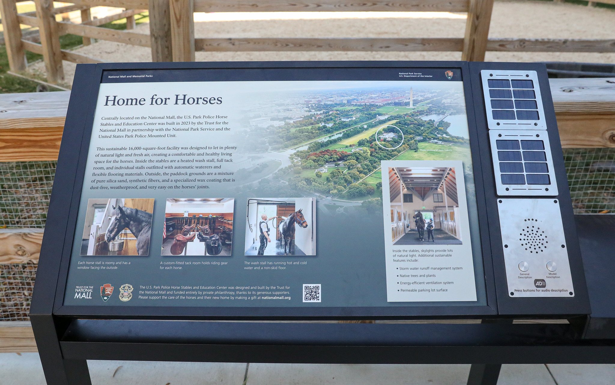 A welcoming education center with a self-guided tour, educational information on the horses and a history of horse mounted patrol operations on the National Mall.