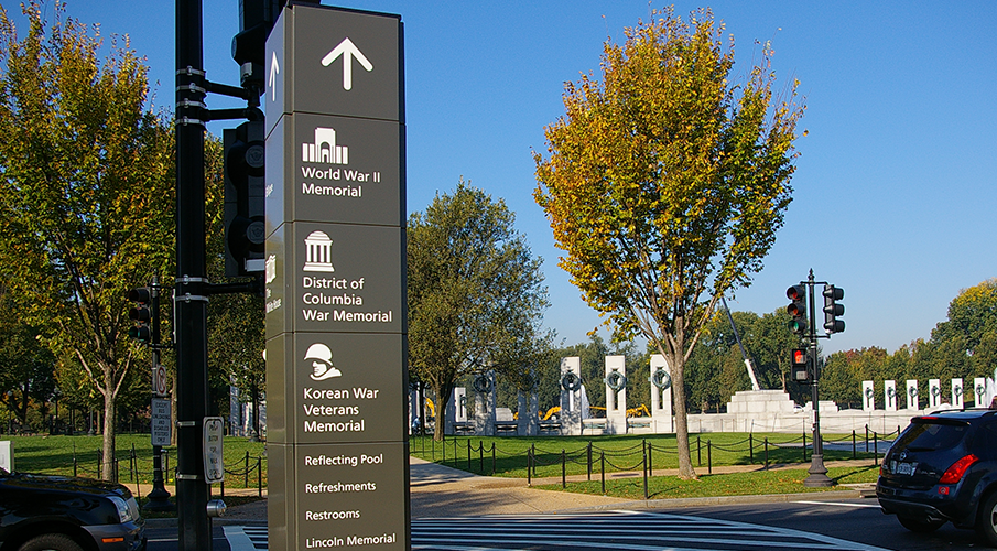 The National Park Service hired Hunt Design (Pasadena, Calif.) to design a system that would improve pedestrian circulation, guide visitors to major destinations, identify monuments and sites, simplify the presentation of rules and regulations governing park use, and reduce sign clutter. Planning began in late 2007, and the final system incorporates nearly 500 new user-friendly signs and directory maps that are integrated with neighboring sponsors and programs that welcomes visitors,and directs them to more than 50 museums, monuments, and memorials.